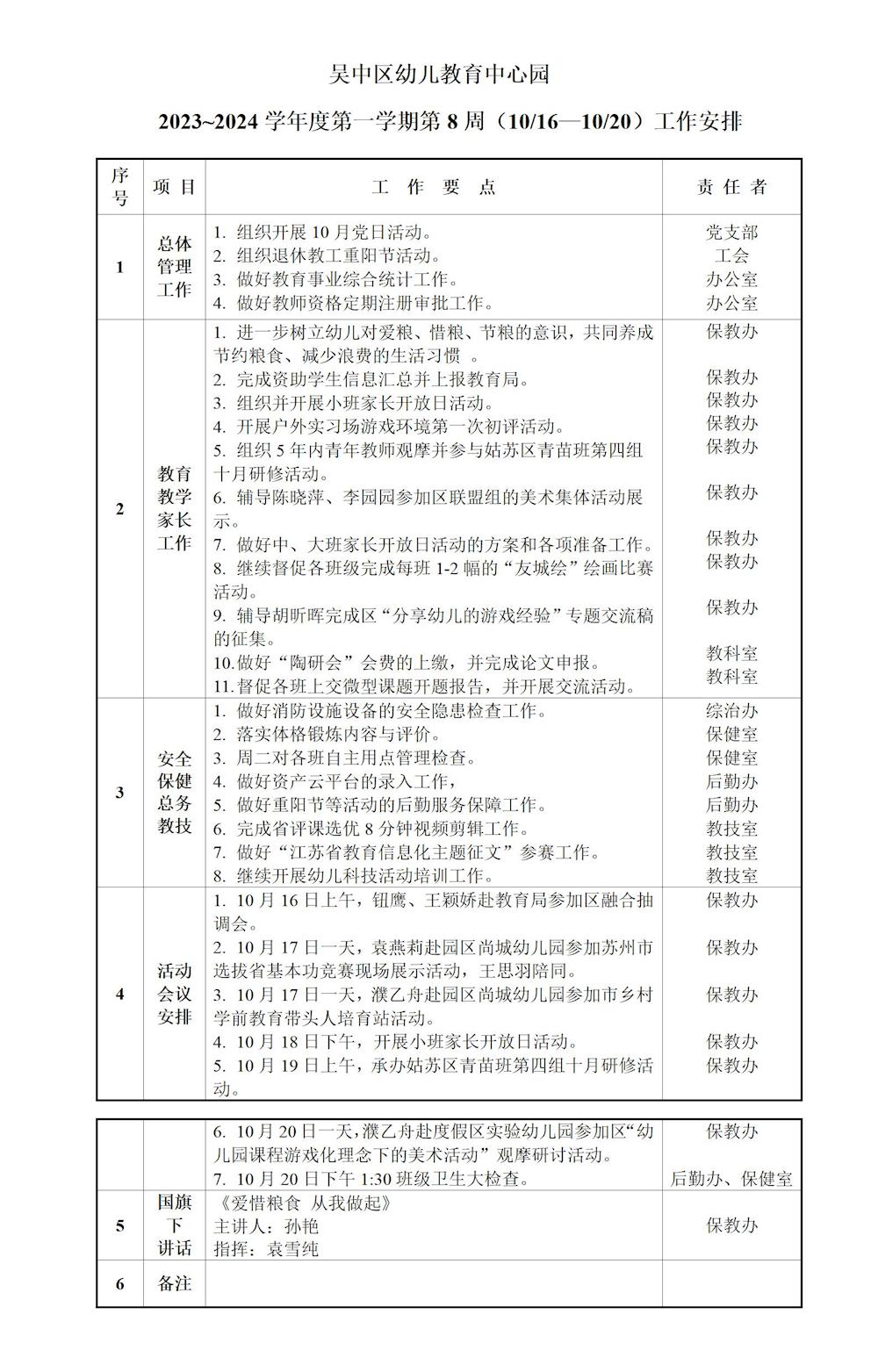 吴中区幼儿教育中心园2023~2024学年度第一学期第8周(10/16~10/20)工作安排