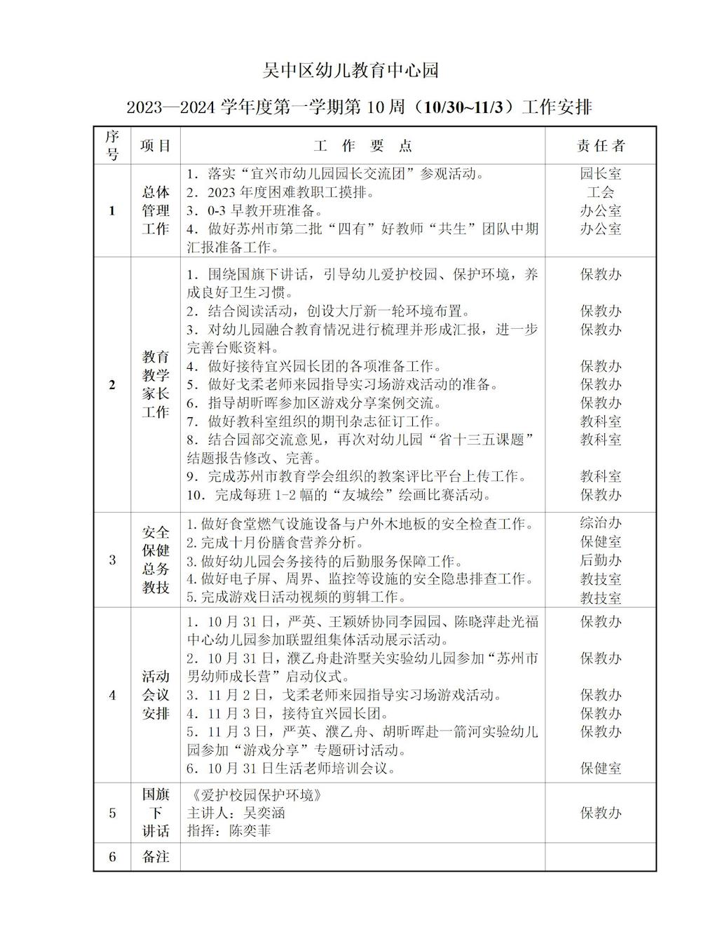 吴中区幼儿教育中心园2023~2024学年度第一学期第10周(10/30~11/3)工作安排