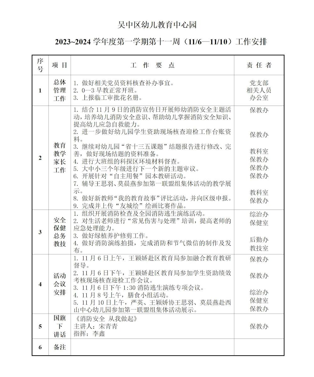 吴中区幼儿教育中心园2023~2024学年度第一学期第11周(11/6~11/10)工作安排
