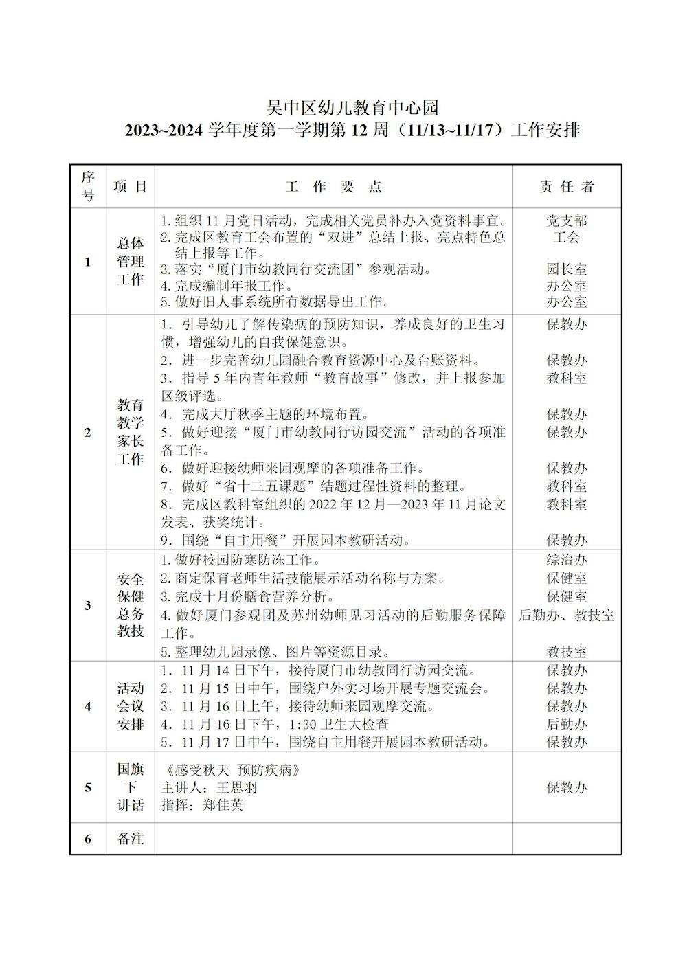 吴中区幼儿教育中心园2023~2024学年度第一学期第12周(11/13~11/17)工作安排