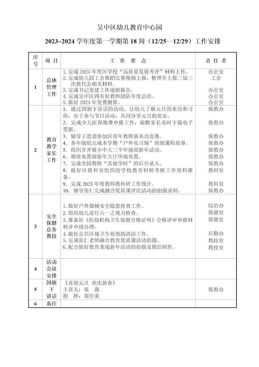 吴中区幼儿教育中心园2023~2024学年度第一学期第18周(12/25~12/29)工作安排