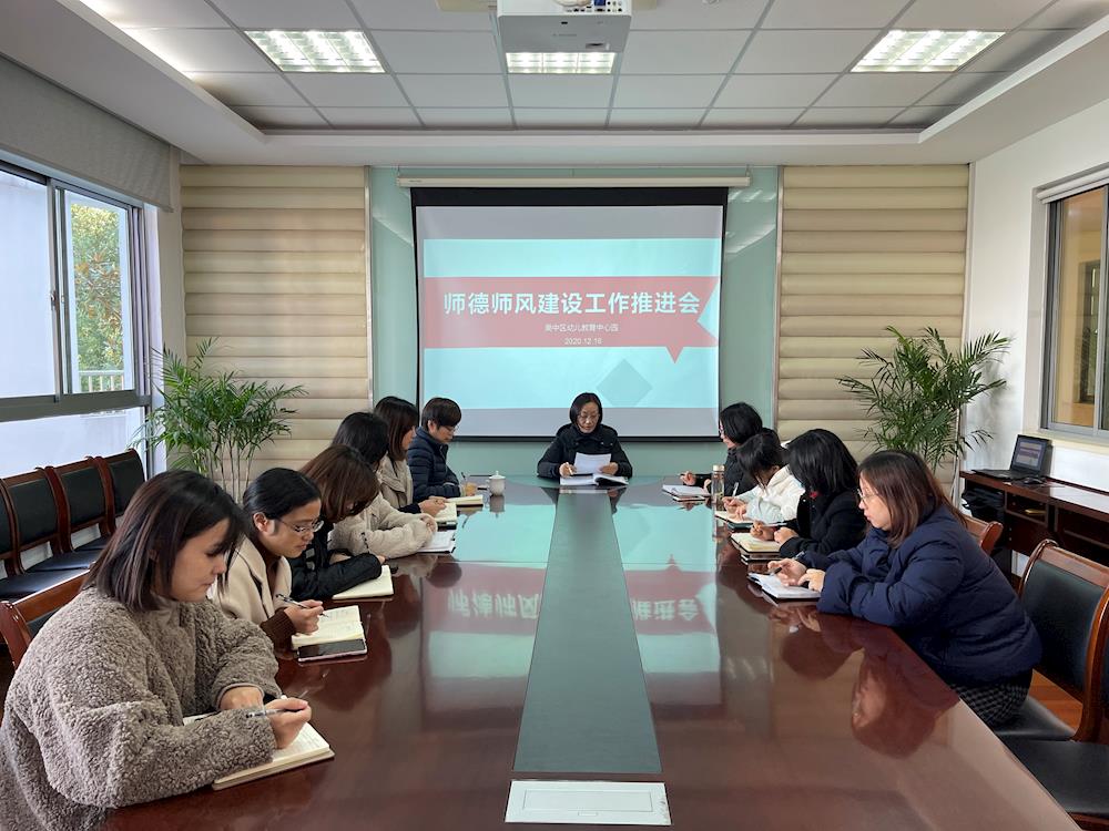 为深入贯彻落实党中央和省、市、区委关于进一步推进师德师风建设的工作要求,2020年12月16日上午,吴中区幼儿教育中心园召开了师德师风建设工作推进会,会议由邢璘园长主持。全体行政人员参加会议。